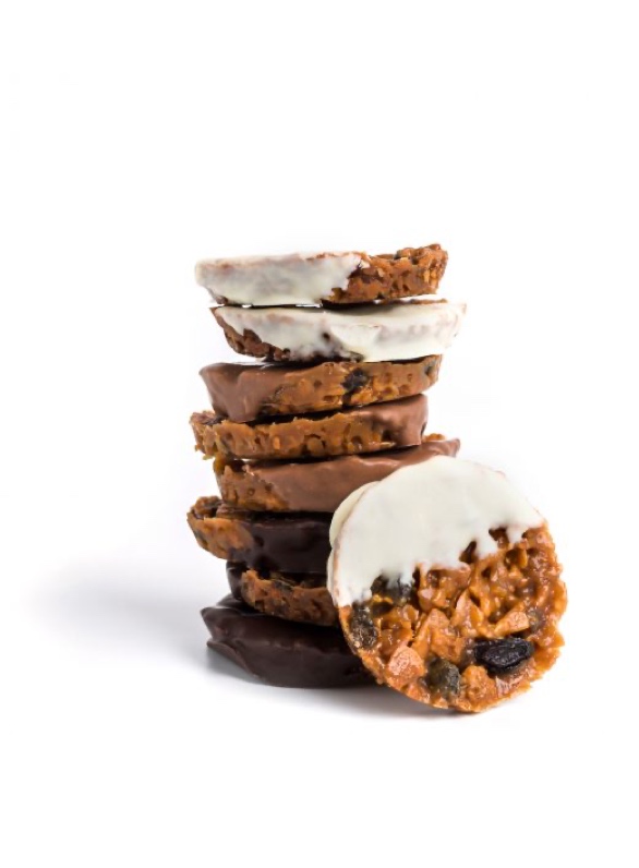 Lightly spiced nuts and preserved fruit held together in chewy caramel, coated on one side with dark, milk or white chocolate.